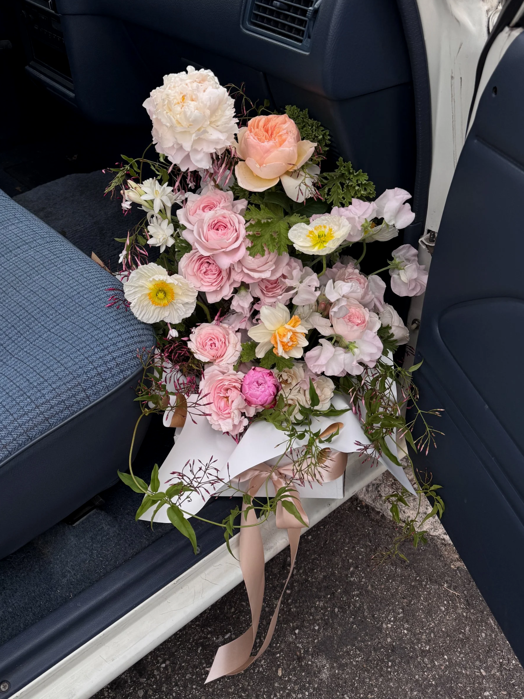As always, arrangements are designer’s choice, but below is the energy you can expect. Pinky, peachy, creamy tones with a tangle of jasmine vine and a pop of yellow. Sweet smellin’ and garden-inspired, using all the best blooms the season has to offer. Garden roses! Sweet peas! Poppies! Peonies! Daffodils! With loads of other in-season favorites and suprises (:
